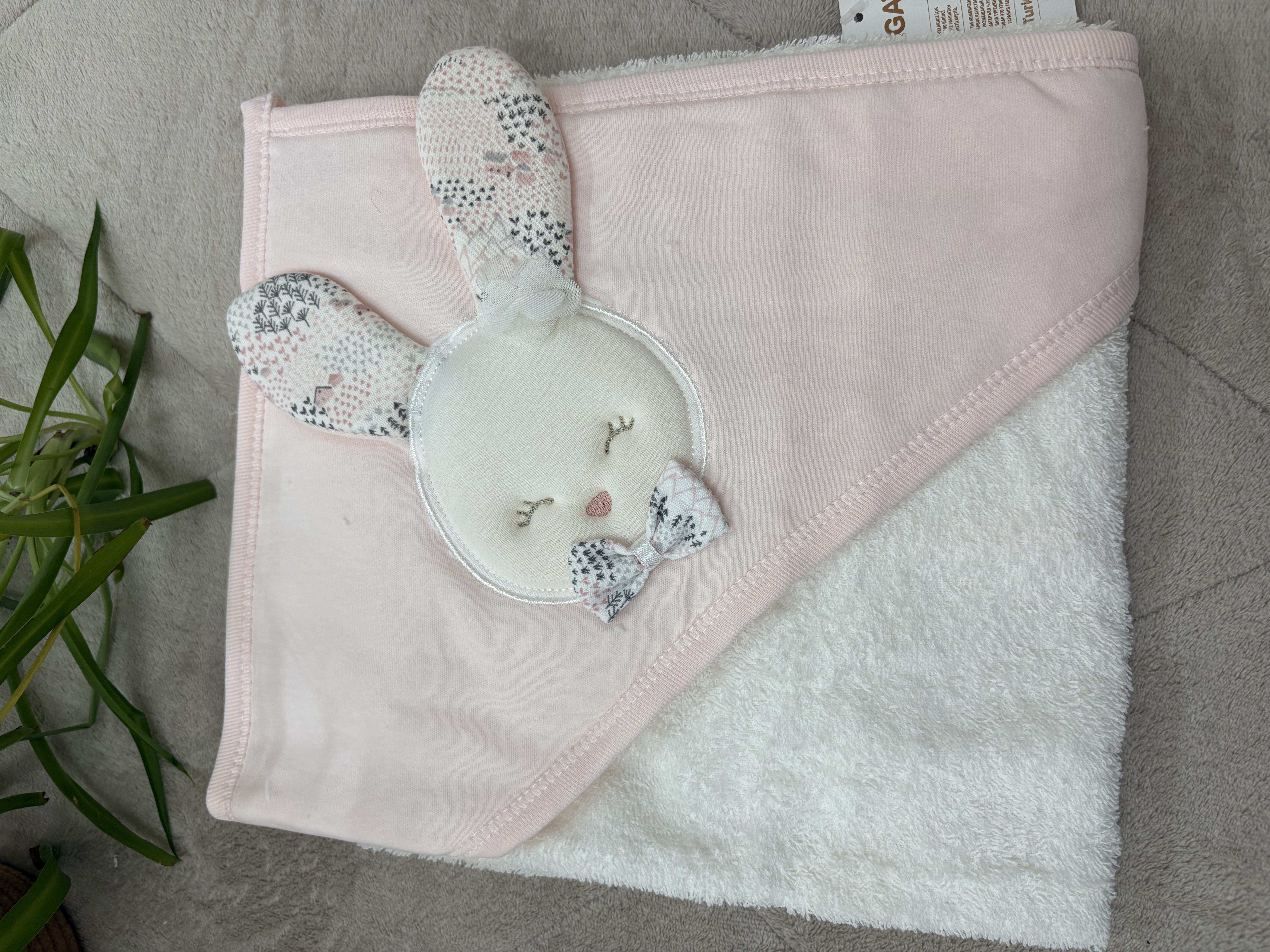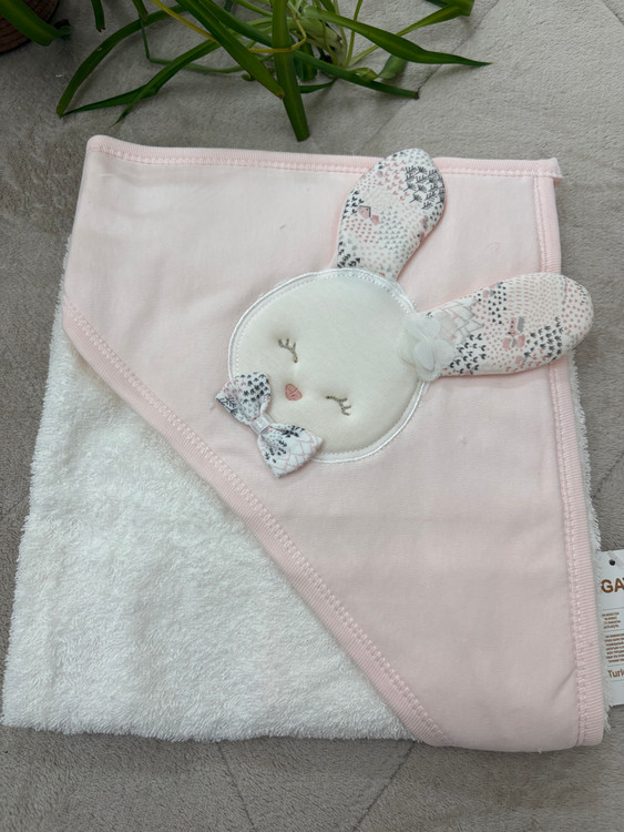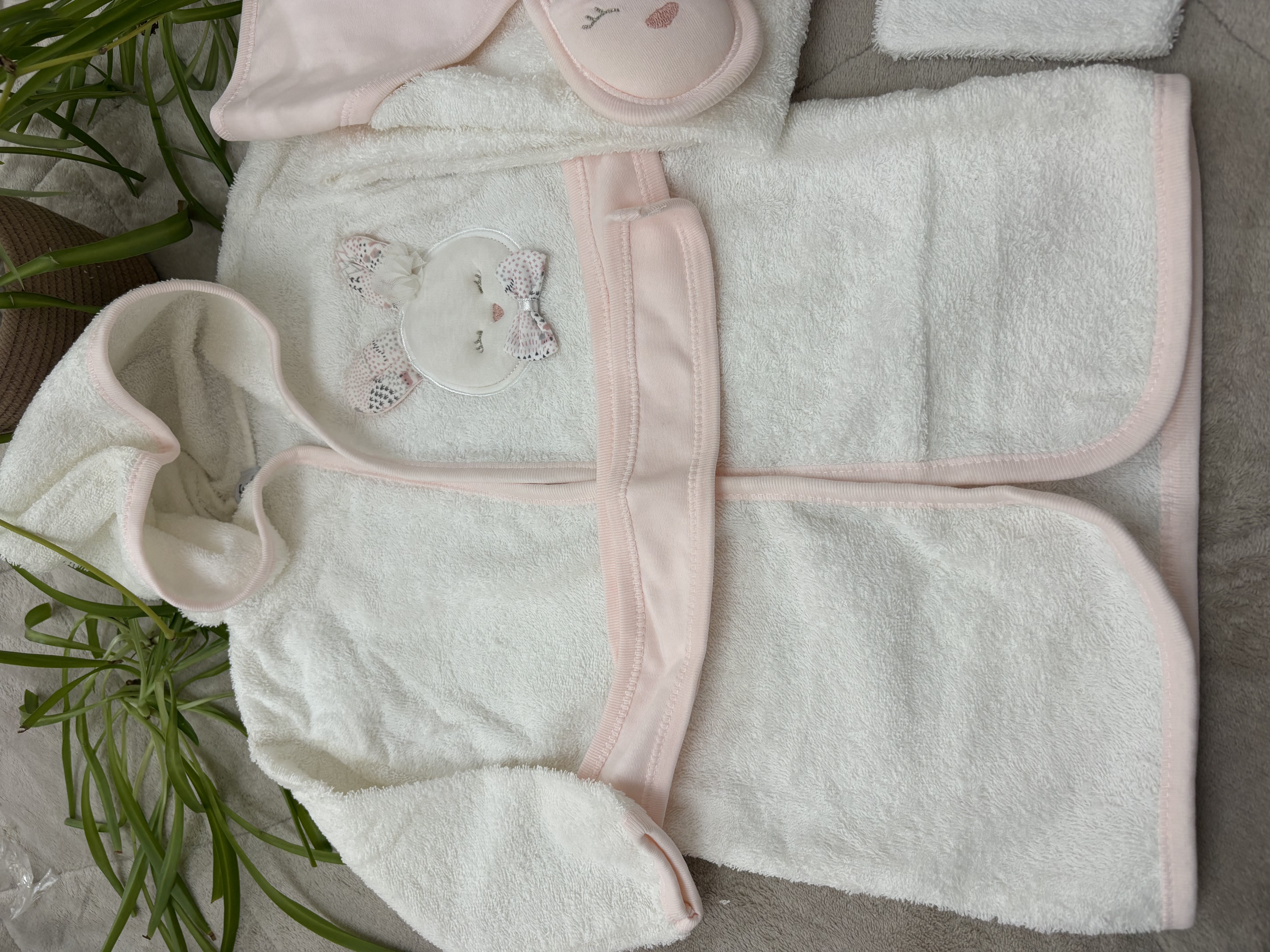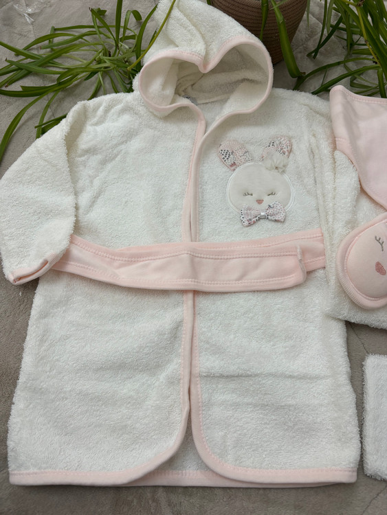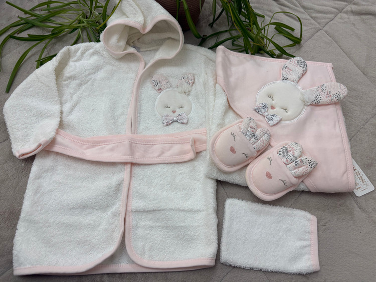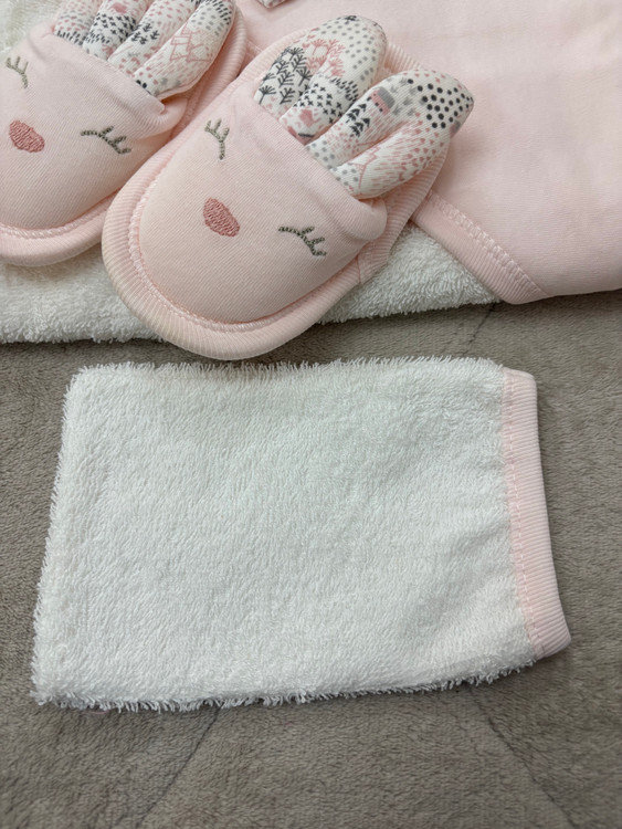 ست ۵ تکه حوله نوزادی دخترانه نخی برند GAYE | شامل حوله تنپوش، دورپیچ کلاهدار، پاپوش حولهای و لیف | فوق العاده نرم و ضدحساسیت